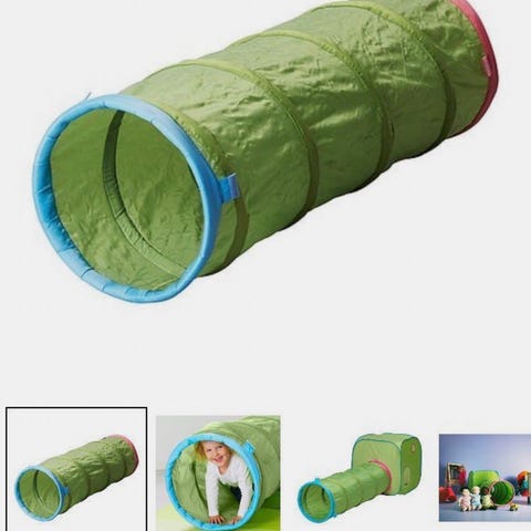 IKEA leketunnel i tekstil for barn. Tunnelen er sammenleggbar og laget i grønt stoff med fargede kanter. Egnet som aktivitetsleke for kryping og lek innendørs. Kan enkelt foldes sammen for oppbevaring når den ikke er i bruk.