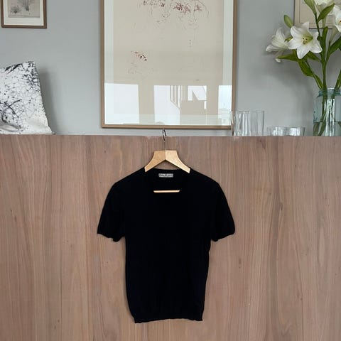 Str S. Klassisk t-skjorte i 100 % merino fra Filippa K. Selges billig da den er godt brukt. Litt slitt under ermene, se bilde. Ellers ingen større slitasje, nupper eller lignende.