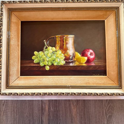 Oljemaleri på lerret signert av Gerald Stinski. Kjøpt på Gumps galley i San Fransisco, antatt på 50 tallet. Motivet viser en hvit skål med røde jordbær, samt noen jordbær liggende foran på et bord, mot mørk bakgrunn. Bildet er innrammet i en profilert, gullfarget ramme med fløyel passepartout med dekorert ytterkant. Str 36 x 25 cm inkl 6 cm rammebredde. Original innramming.