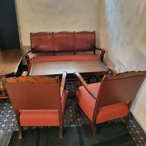 Sett med to lenestoler og et lite sidebord i klassisk stil. Stolene har utskårne treverkdetaljer og stoppede seter og rygger med håndbrodert blomsterdekor i lyse tekstiler. Sidebordet er lite og rundt med matchende treverk. Passer til en liten sittegruppe i stue, lesehjørne eller tilsvarende rom der man ønsker et klassisk preg.