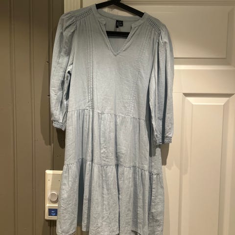 Vero Moda hverdagskjole for dame i størrelse S. Kjolen er i lys blå farge og laget av bomull. Den har v-hals, trekvart lange ermer med lett puff og elastikk nederst, samt flere volanger i skjørtet som gir en løs og komfortabel passform. Egnet som hverdagskjole i vår- og sommersesongen.