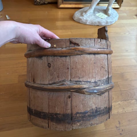 Tre kiste, rottingstol og hvit romdeler