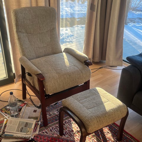 Regulerbar lenestol m/ fotskammel selges, pent brukt
