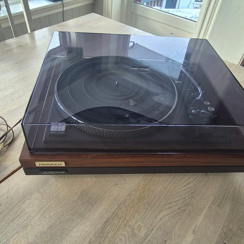 Platespilleren er i tre og metall med lokk i plast.
