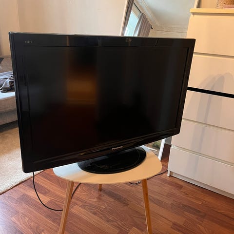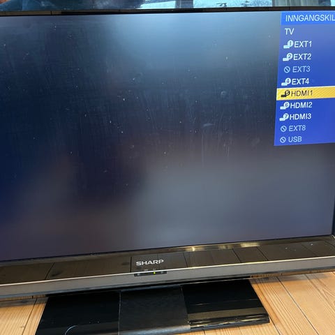 Sharp Aquos LCD-TV i svart utførelse. TV-en har innebygd høyttalersystem med TruSurround- og BBE-merking på fronten. Modellen står på en buet bordfot og er egnet for plassering på TV-benk eller bord. Det er også fester for veggfeste. Bak på TV-en finnes tilkoblinger for eksterne enheter (se egne bilder eller etikett for detaljer om innganger og modellnummer). Passer til vanlig TV-bruk, tilkobling av dekoder eller bruk sammen med eksterne mediespillere og spillkonsoller, avhengig av tilgjengelige innganger på modellen.