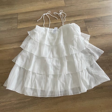 Zara stroppeløs topp for dame i størrelse M. Topp i hvit med volanger og rynkedetaljer rundt livet for en lett og luftig passform. Elastisk parti øverst for bedre hold. Egnet til bruk om sommeren eller til festlige anledninger, og kan kombineres med både skjørt, bukser og shorts.
