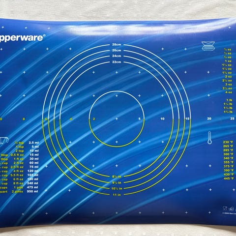 Tupperware bakeunderlag . Underlaget har sirkler og mål trykket på for enkel utbaking og oppmåling av deig. Egnet til bruk på kjøkkenbenk ved baking og utbaking av ulike typer deig. Kan rulles sammen for oppbevaring.