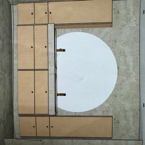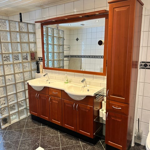 Baderomsmøbler fra Megaflis (2020): servant med blandebatteir og møbel med to skuffer (80 cm), høyskap med to skap (speil på innsiden), speilskap med to dører og lampe. Er laget til med koblingsboks og stikkontakt på speilakpet. Selges samlet. Er skrudd ned i forbindelse med oppussing.