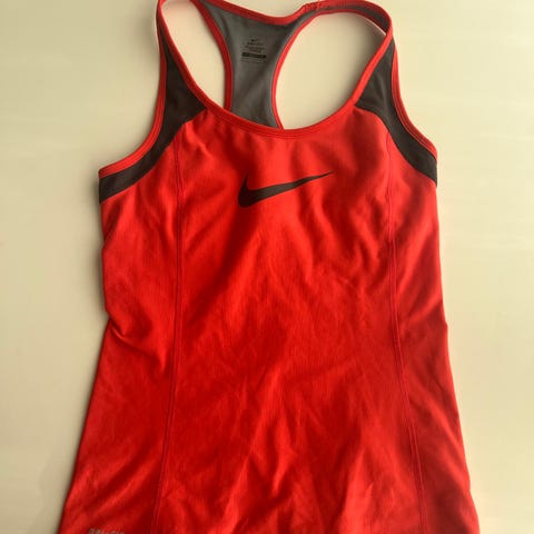 Nike Dri-Fit Cotton Tee treningstopp for dame i størrelse M. Ermeløs topp i rødt stoff med rund hals. Laget i bomullsblanding med Dri-Fit-teknologi som transporterer fuktighet bort fra kroppen. Passer til trening og annen fysisk aktivitet.