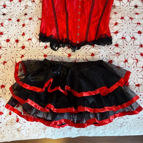 Lite brukt Harley Quinn topp i str M/L selges for 200kr.🤩 Det ene «hengselet» bak har løsnet litt se bilde 4 og det er også noen små løse tråder - se eksempel på bilde 5. Verken større skader eller skader av betydning.