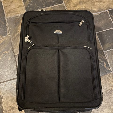 Sort trillekoffert i stoff i god stand.