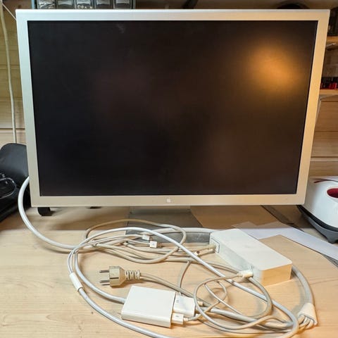 Mac Skjermen har innebygd fot med kabelstyring og leveres med tilkoblingskabler som vist på bildene. Egnet som ekstern skjerm til stasjonær eller bærbar datamaskin som støtter tilkoblingen denne modellen bruker.