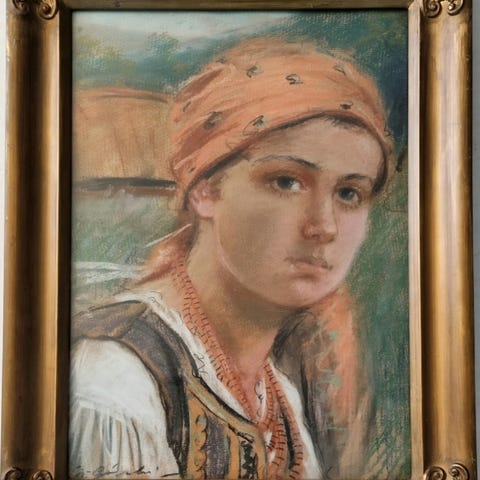 Stilleben av Gerald Stinski antatt kjøpt på 1950 i SanFransisco. Maleri med frukt motiv, som viser druer, sitron og eple ved en glasskanne på bordflate. Bildet er utført i naturtro stil med mørk bakgrunn som fremhever motivet. Maleriet er innrammet i en dekorativ gullfarget ramme med profilerte detaljer og bred innramming i fløyel rundt selve motivet. Str 38 x 29 cm med 6 cm fløyelspassepartout. Original innramming.