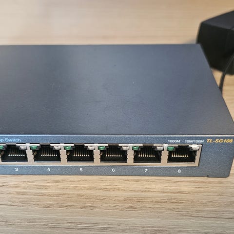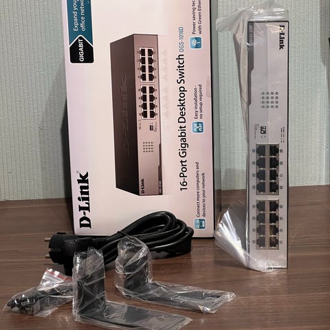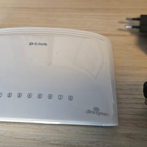D-Link DGS-108 nettverksswitch med 8 RJ45-porter for kablet nettverk. Enheten er svart og har metallkabinett. Strømforsyning 5V / 1A (ekstern adapter). Egnet for utvidelse av kablet nettverk i hjem eller mindre kontor, for tilkobling av flere enheter som PC, skriver og andre nettverksenheter.