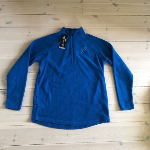 Helt ny og ubrukt Janus ulltrøye i merinoull, str 140. Turkis, med mønster i grått på ermene og sennepsgul glidelås i halsen. 95% merinoull, 5% polyamid. Unisex.