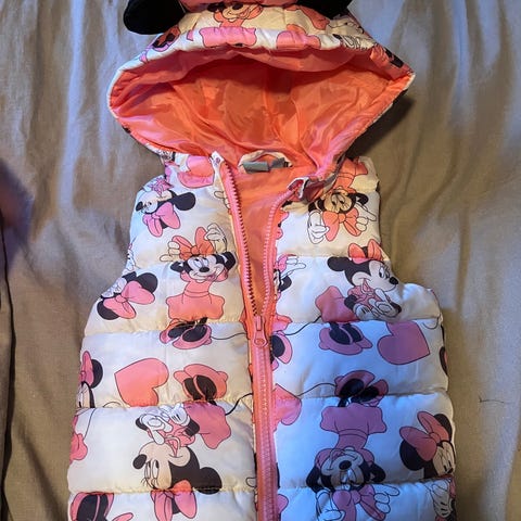 Minnie mus vest med små anmerkninger, den har et par velfig små flekker som nok vil gå vekk med litt flekkfjerner, men ikke sjenerende. Kjempefin på.