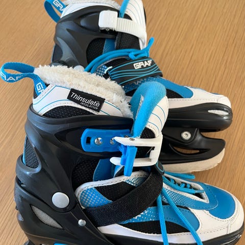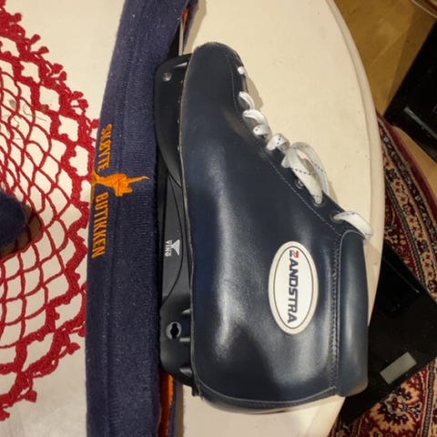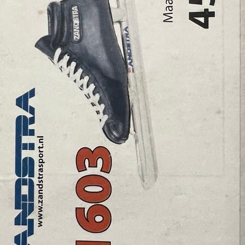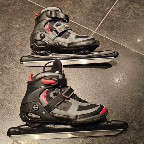 Zandstra skøyter i størrelse 45. Modellen har kombinasjon av snøring og borrelåsreim for god tilpasning rundt foten. Overdelen er i tekstil og syntetisk materiale i grått og hvitt, med plaststøtte rundt hæl og ankel for økt stabilitet. Skøytene har stålskinne og er egnet til generell skøytebruk på is, for eksempel tur og fritidsbruk.