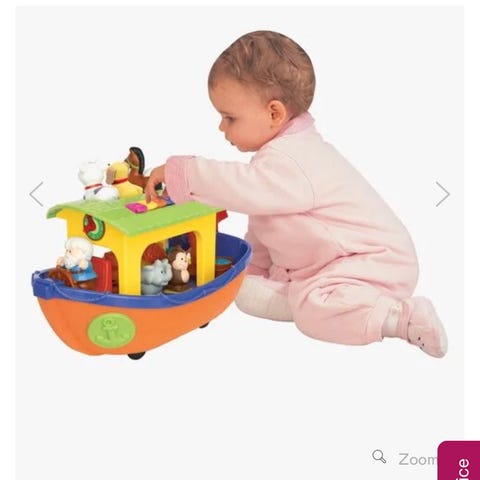 Fisher-Price lekebåt Noahs ark med figurer. Lekesettet består av en fargerik båt formet som Noahs ark med hjul under, slik at den kan trilles bortover gulvet. Båten har plass til flere små dyrefigurer og en Noah-figur, som kan plasseres både inne i båten og på dekk. På taket er det en rad med fargede klosser som kan trykkes på for enkel lek og utforsking. Egnet som rollelek for små barn som liker dyr, båter og figurer.