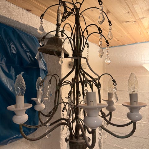 Stor lysekrone i tre og metall. Høyde 81cm bredde 87 cm. Kan males/ spayes i ønsket farge evetuelt. Hentes i 3470 Slemmestad i Asker