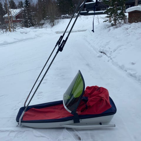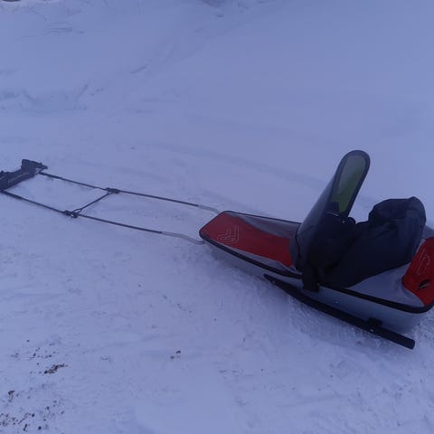 Fjellpulken pulk (smal type) med hundedrag og rødt trekk. Stivt dragfestesystem foran, samt trekk som beskytter innholdet mot snø. Egnet til transport av bagasje eller utstyr på ski- og vinterturer. Pulkens skrog er i hardplast med fjærbelastet dragfeste foran, og har festepunkter langs sidene til sikring av last. Hentes i Elverum.