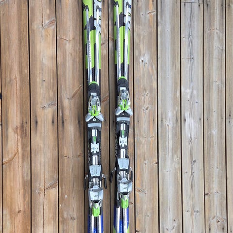 Elan maxx alpinski med utenbindinger blå/grønn