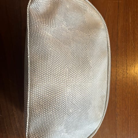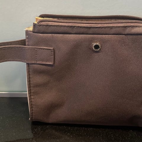 Helt ny toalettmappe i brunt kunstlær. To-delt med håndtak. Ukjent merke og modell.