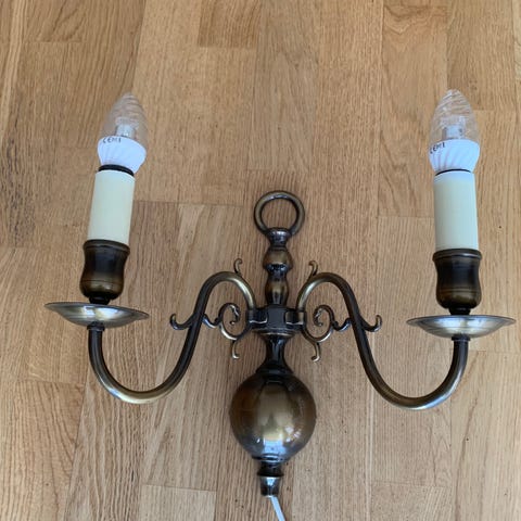 Vegglampe i messing med to lampeuttak selges. Modell fra 1980/90- Tallet.
