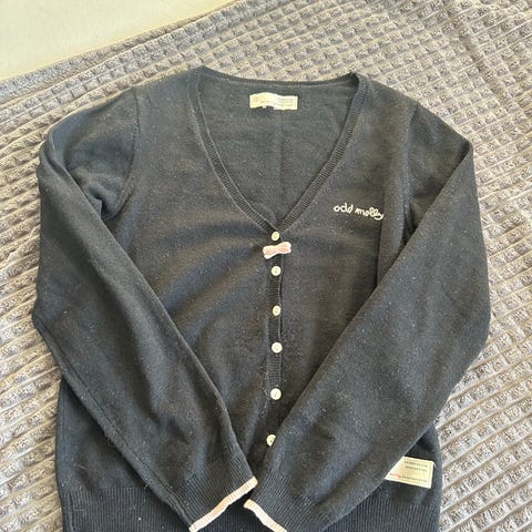 Odd Molly cardigan for dame i størrelse S. Cardiganen er i grå ull med v-hals og knepping foran. Modellen har lange ermer og ribbestrikkede kanter nederst og på ermene. Diskré Odd Molly-merkelapp er plassert nederst på ermet. Passer som varm og myk overdel til hverdagsbruk eller lag-på-lag i kjøligere vær.