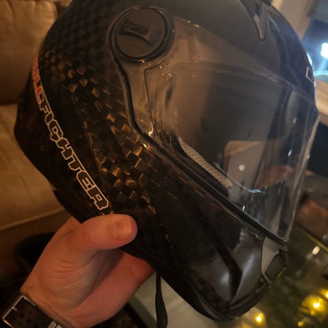 Shoei helhjelm i størrelse XXS (51–52 cm). Hjelmen er heldekkende med visir foran. Fargekombinasjon hovedsakelig hvit med dekorative mønstre i gull/brunt og svart. Innvendig polstring rundt hele hodet og hakepartiet. Egnet som motorsykkelhjelm eller mopedhjelm for førere med liten hodeomkrets innenfor oppgitt størrelse.