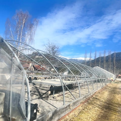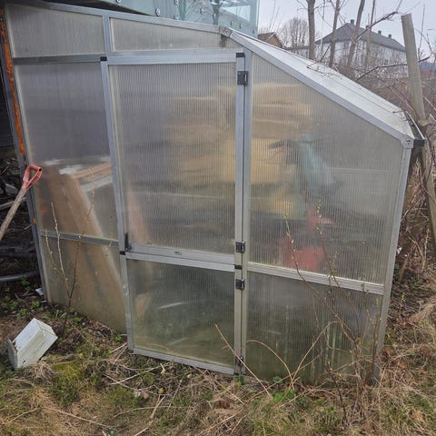 Litt usikker på når det er kjøpt, noen av buene har blitt noe deformert, men bør ikke være noe problem å få rettet når det er demontert. Ellers er det i god stand, det er romslig med plass til ca 12 pallekarmer. Vi har brukt ene delen til vinterhage og resten til dyrking. Er også veldig fint til oppbevaring av utemøbler om vinteren.