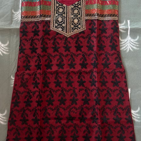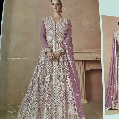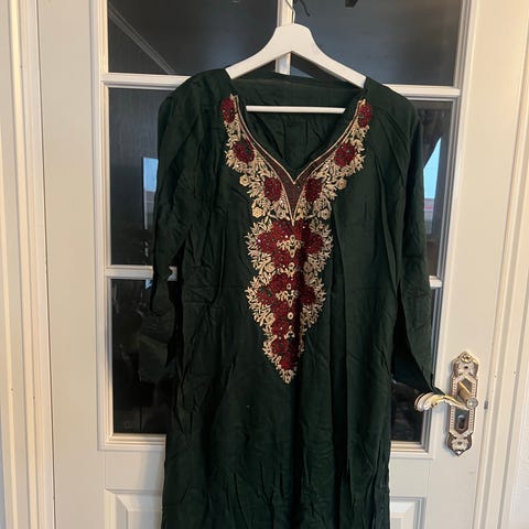 Indisk shalwar selges. Brukt en gang, brunlig topp med flerfargede broderier, grønne bukser og sjal som er i samme farge som bukse og overdel.