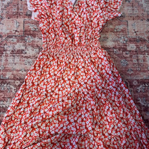 Selge den då den bare blir liggende i skapet. Fine detaljer med fine forskjellige fargar. Er ein type maxi kjole. Har fine perler oppe med halsen og er lang. Passer fint til ein fin anledning/ fest eller for å pynte seg litt