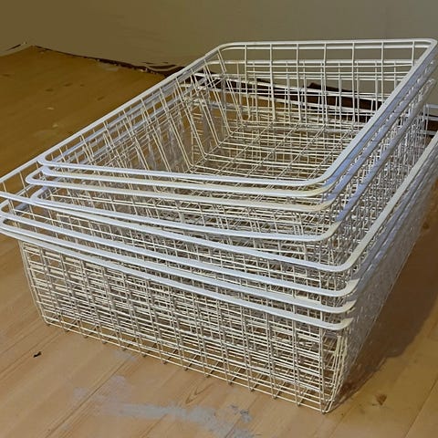 Selger trådkurver med skinner, en praktisk oppbevaringsløsning for garderobe eller skap.