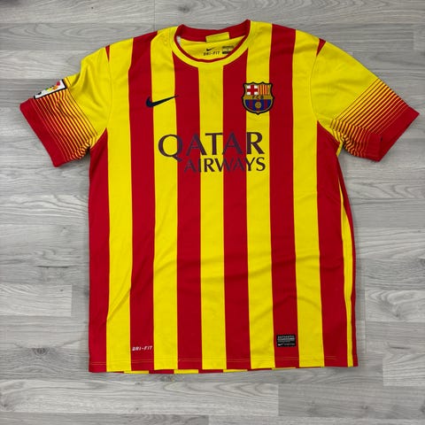 Nike FC Barcelona fotballdrakt i størrelse L. Drakten er gul med røde detaljer og klubbemblem på brystet, samt sponsorlogo på fronten. Laget i lett og pustende polyesterstoff egnet for fotball og annen fysisk aktivitet. Passer som supportereffekter eller til bruk på trening og fritid.