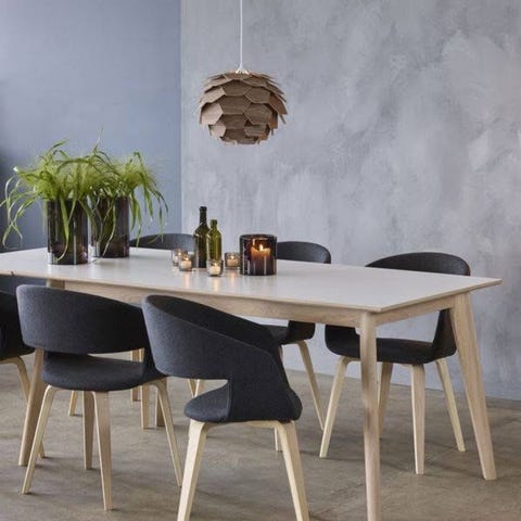 Spisebord i lys eik. Uten ileggsplate er bordet 200 cm, 240 cm med plate. Noe fargeforskjell på ileggsplate og bord, men syns ikke det vises så godt i virkeligheten. Bruksmerker finnes og kan helt sikkert ha godt av overflatebehandling. Nypris 15999. Selges for 2000.
