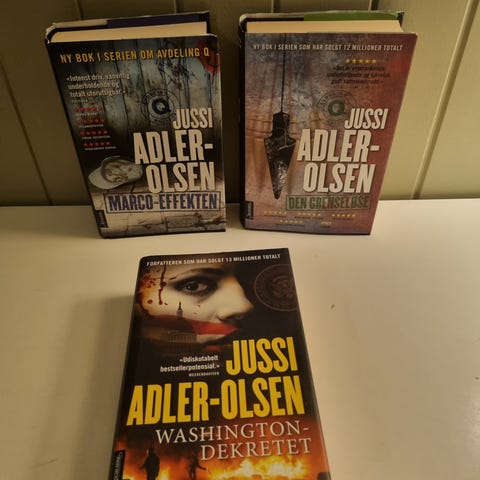 Bøker av Jussi Adler-Olsen selges kr 30,- for pocket og kr 40,- for innbundet