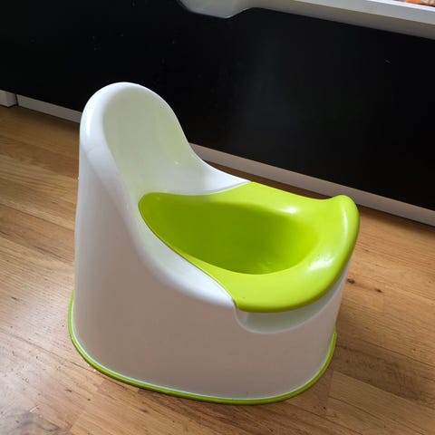 Potte i hvit plast. Utformet for små barn ved toaletttrening. Har høy ryggstøtte og antiskli-felt på føttene for bedre stabilitet på gulvet.