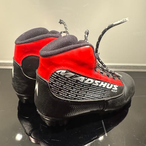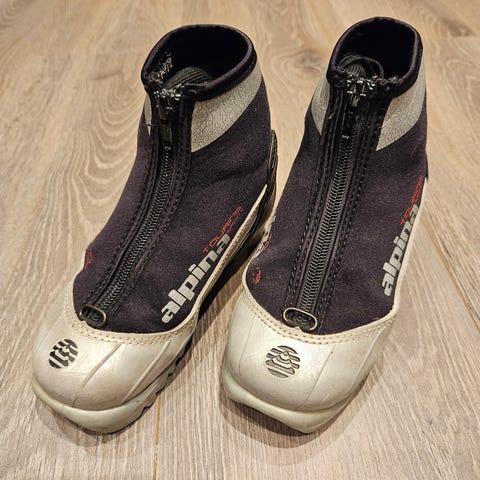Skiskoene er fra Alpina, med overdel i svart, hvitt og rødt. Sålen er tilpasset Rottefella-systemet som er montert på skiene. Utformingen tyder på at de er beregnet for klassisk langrenn. Settet kan brukes til vanlig langrenn og turaktiviteter på preparerte løyper.