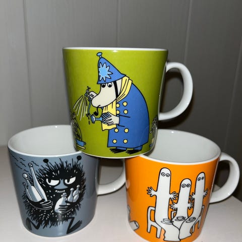 Arabia Mummi krus i porselen. Krusene har ulike Mummi-motiver i flere farger, blant annet blå, oransje og rosa. Egnet til servering av varme og kalde drikker på kjøkken eller spisebord. Krusene har hank og glanset overflate, og kan brukes både til hverdags og ved andre anledninger.