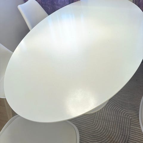 4 hvite stoler med sølv ben. Bordet er kjøpt på bolia, er et liten skade på siden, men om den oljes så er den ikke så synelig.