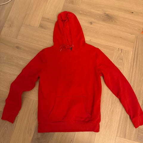 Holzweiler hettegenser for dame i størrelse M. Genseren er rød og har hette med teksten "LOVE ME NOT" brodert langs kanten. På brystet er det et rundt merke med kleshenger-motiv. Ribbekanter nederst og på ermene. Materialet er hovedsakelig bomull med innslag av polyamid og elastan for bedre passform og komfort. Passer til hverdagsbruk og som en casual overdel.