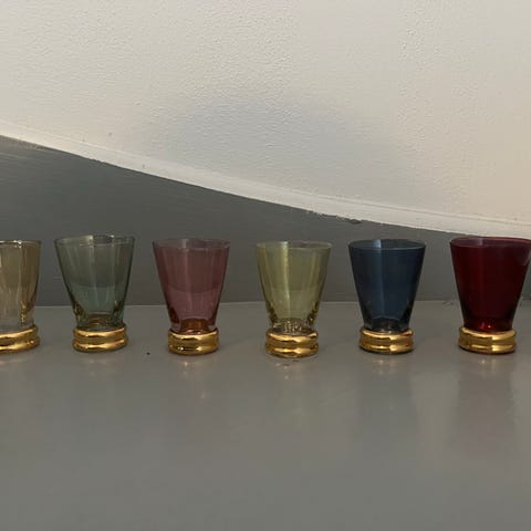 6 nydelige glass med flott dekor i rødt, gult, grønt eller blått 11, 7 cm høyt. Kan passe til likør, aperitif, konjakk, vin m.m. Alle glassene som ny, ingen skår o.l. Fin også å gi i gave. Selges samlet. Kan møtes i Trondheim sentrum eller sendes godt innpakket mot dekning av porto. Norgespakke med sporing og forsikring fra posten.
