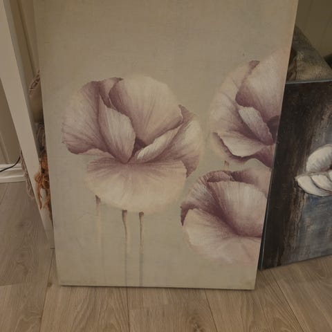 Flott originalt maleri fra Barcelona. Mål ca: 100 x 100 cm. Bildet har et lyst, strukturert bakgrunnsfelt med blomster i dempede naturtoner. Passer som veggdekor i stue, soverom eller gang.