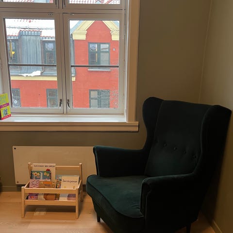 Selger pent brukt IKEA lenestol med fotskammel (beige stoff), som ny og klar for henting.