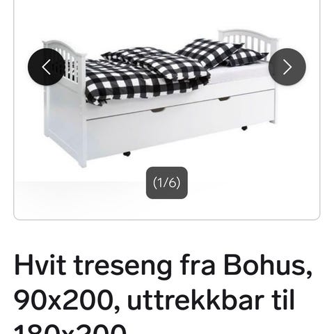 Bohus seng med uttrekksseng i hvit utførelse. Kjøpt ny for 2 år siden. Hovedsengen har klassisk ramme med hode- og fotende i tre. Under sengen er det en uttrekksseng som kan brukes som ekstra sengeplass. Passer til standard madrasser i enkeltseng-størrelse. Egnet til barnerom, gjesterom eller andre rom der det er behov for en ekstra liggeplass som kan trekkes ut ved behov.