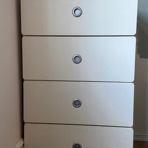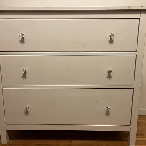 Pen kommode, hvitmalt, demihvit, med gustaviansk preg. Tre skuffer som er malt innvendig.