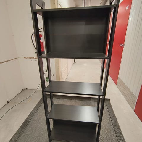 IKEA vegghylle i hvit utførelse. Hyllen har et trappeformet design med flere nivåer, og er laget av sponplate med hvit overflate. Den monteres på vegg med medfølgende metallbeslag. Egner seg til oppbevaring eller utstilling av mindre gjenstander langs vegg, for eksempel ved peis eller i stue.