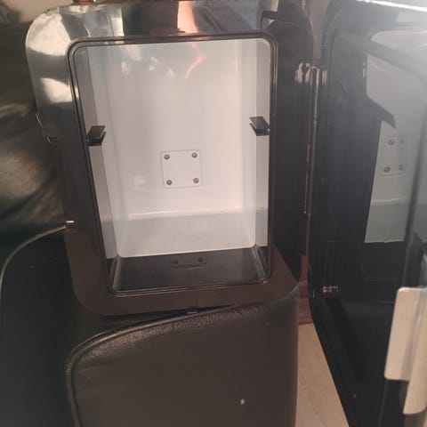 DeskChiller minikjøleskap i svart plast. Enheten har både kjøle- og varmefunksjon som kan velges via bryter på baksiden. Kan drives med både 220–240V AC og 12V DC (for eksempel i bil), med tilkoblinger for begge deler. Innvendig plastkabinett med liten kjøle/varmeflate på bakveggen, egnet for oppbevaring av mindre mengder drikke eller mat. Kompakt størrelse som passer på skrivebord, kontor, soverom eller i bil/bobil der det er behov for enkel kjøling eller oppvarming av innhold.