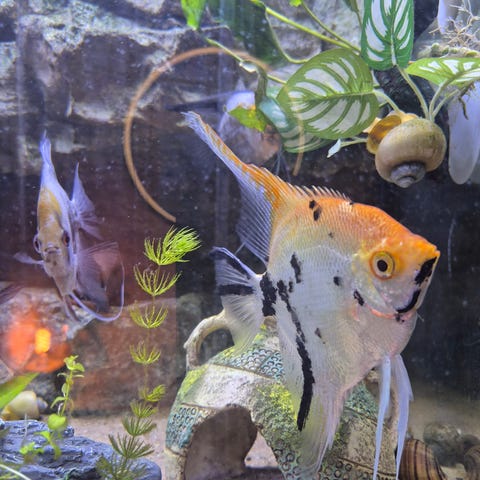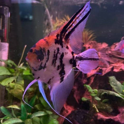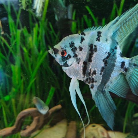 Min kjære 5 år gamle Blue Marble Scalare (Pterophyllum scalare – Blue Marble-variant).