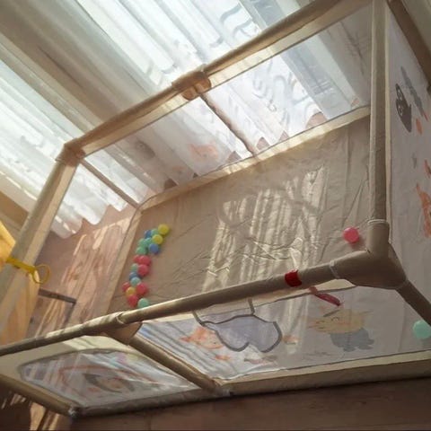 Selger vår lekegrind fra Dresmbaby 🩶 Den er sekskantet og kan åpnes med glidelås. Har hatt en rund lekematte i bunnen, da den ikke er polstret. Sugekopper under føttene for å sikre stabilitet.